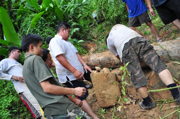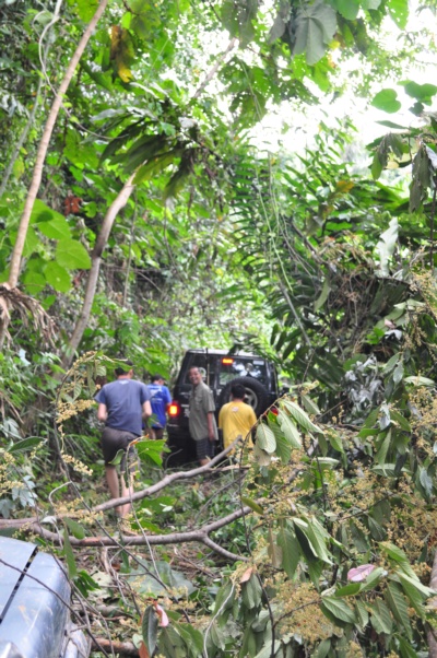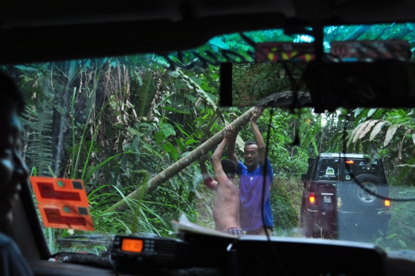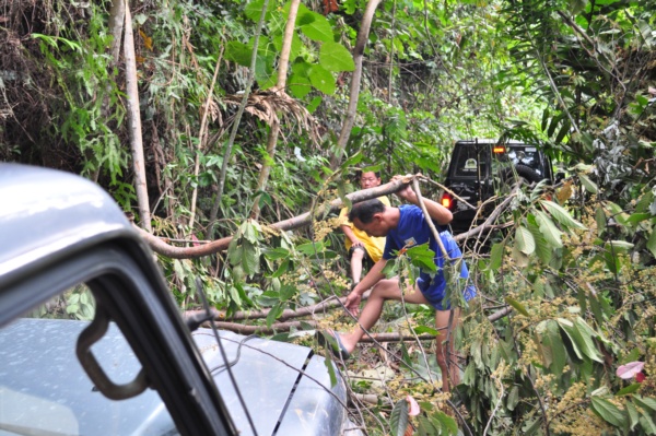路況不理想,現在要把架在車頂的架子拆下來,要從倒塌的樹下穿過去。