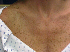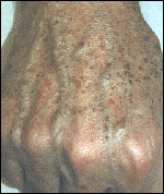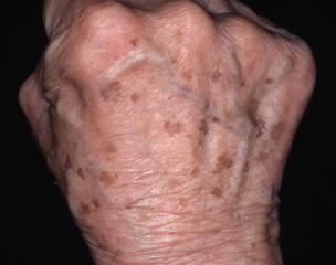 Age spots are also known as sun spots, liver spots, lentigos, or lentigines. These lesions are flat, tan, brown, or dark brown spots on sun-exposed skin. As people age, sun spots most commonly appear on the backs of the hands, the forearms, neck, chest, and face. Sun spots are associated with cumulative sun exposure. The pigment producing cells in the skin (called melanocytes) are activated to produce more pigment (melanin) by ultraviolet rays. While these spots are not themselves cancerous, you may be at risk for skin cancer if you have them.