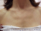 Age spots are flat and vary in size from a small pea to a dime. They usually are somewhat round and have irregular borders. They are found on chronically sun-exposed areas such as the shoulders, upper back, face, forearms, and the back of hands.