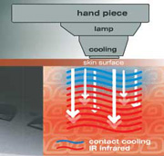 While the epidermis is protected via continuous skin contact cooling the infrared light stimulate dermis fibroblast activity and collagen contraction.