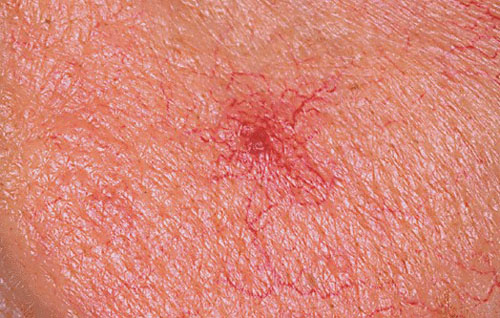 Compression of the central vessel temporarily obliterates the lesion. Lesions are acquired. One lesion or small numbers that are unrelated to internal disease may occur in children or adults. Patients with hepatic cirrhosis develop many spider angiomas that may become quite prominent. Many women develop lesions during pregnancy or while taking oral contraceptives. The lesions are asymptomatic and usually resolve spontaneously about 6 to 9 mo postpartum or after oral contraceptives are stopped. Lesions are not uncommon on the faces of children.